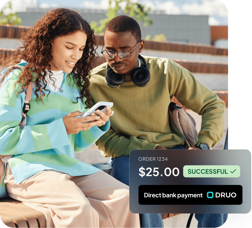 Ya sea en línea o en tienda, paga directamente desde tu cuenta bancaria con DRUO.
